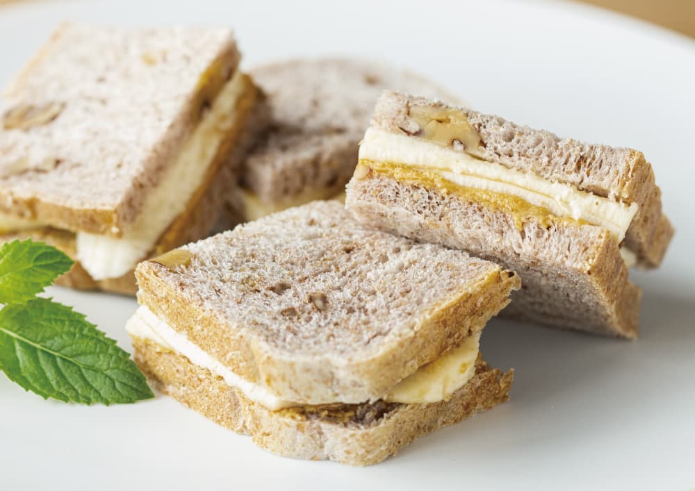 バナナサンド全粒粉くるみパン、千葉県産落花生100%のビーナッツバター、ともに自家製。ハーフサイズもご提供いたします。